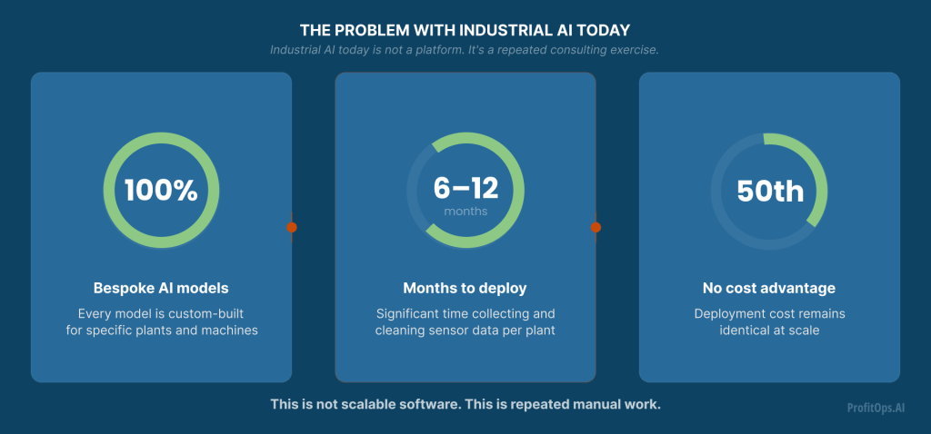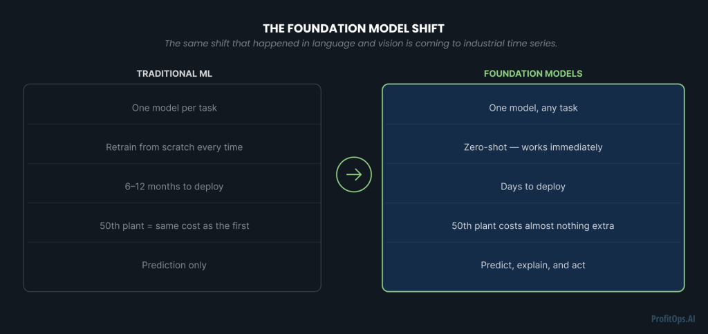 You hire a data science team, spend 6–12 months collecting and cleaning sensor data, train a model specific to Plant A, Machine 3, Line 2. It works reasonably well until the process changes, new equipment arrives, or production shifts. Then you retrain. Then you repeat the whole exercise for Plant B. And Plant C.