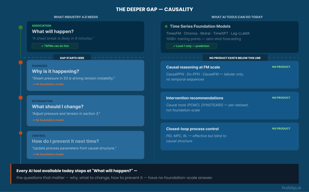But here’s the thing: the foundation model revolution has not yet reached manufacturing in its most important dimension. Yes, TimesFM, Chronos, Moirai, TimeGPT — these are impressive zero-shot forecasting models for time series. They solve the “train once, predict anywhere” problem. But they stop at prediction.