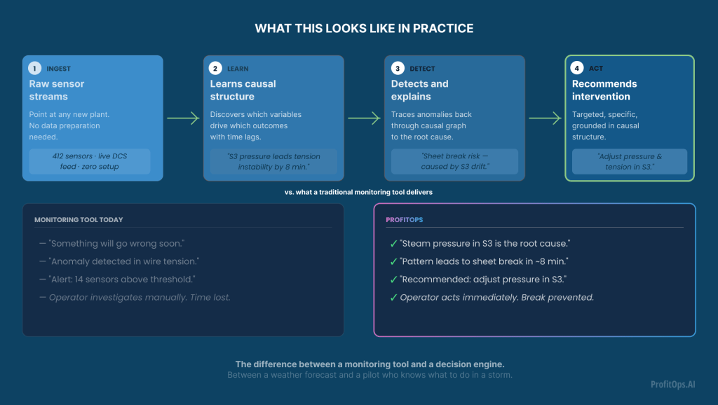 A Causal Time Series Foundation Model for industrial processes accepts raw sensor streams from a new plant and begins operating zero-shot no months of data preparation. It discovers the causal structure of that specific process: which variables drive which outcomes, with what time lags, under what conditions. When an anomaly is detected, it doesn’t just alert — it explains: “steam pressure in section 3 is causing wire tension instability, which will lead to a sheet break in approximately 8 minutes.” Then it recommends a specific intervention: “reduce steam pressure by 4% and increase wire tension by 2% to stabilize.”