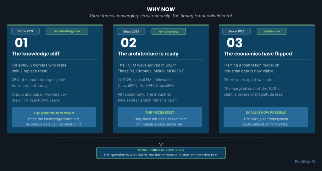 Manufacturing’s next crisis isn’t machine failure, it’s knowledge loss. Foundation models that predict and reason causally over industrial time series aren’t just an upgrade; they’re the infrastructure that keeps decades of operator expertise alive, scalable, and actionable long after the experts have left.